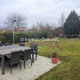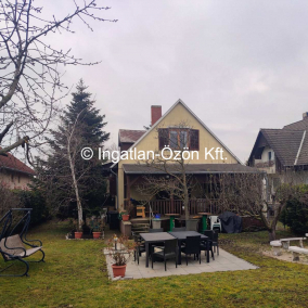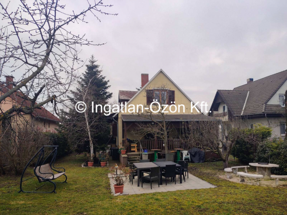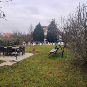 A telek szépen parkosított, örökzöldek övezik körbe a kerítés vonalán, így biztosítva a lakók intim szféráját. A kertben faház szolgál tárolóként, illetve van egy nagyméretű ciszterna a nyári locsoláshoz.